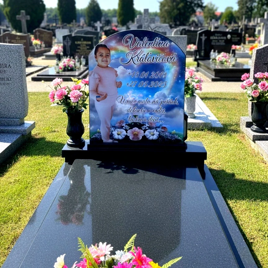 Pomník je osadený do kamenného podstavca, ktorého farbu prispôsobíme vášmu hrobu. Každému zákazníkovi vyhovieme do detailu. Pošleme vám rôzne vzory pozadí alebo použijeme vaše. Náš tím grafikov vám pripraví grafický návrh, ktorý budeme naďalej upravovať až do maximálnej spokojnosti. Samotný pomník je plne farebný a kalený, čo spôsobuje nerozbitnosť a trvácnosť minimálne 100 rokov. Fotografia, ktorá sa vytlačí na sklo sa zakalí a tým sa stáva neoddeliteľnou súčasťou skla. Oddolný poveternostným vplyvom.